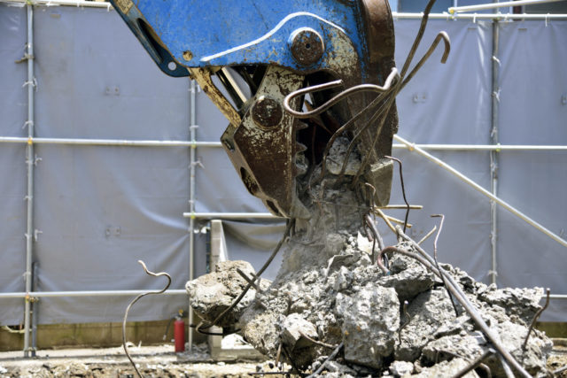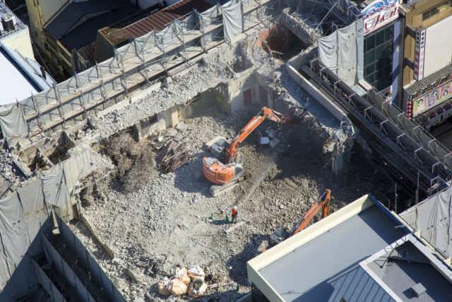 粉塵を抑えるために放水作業を実施したり、防音シートの設置、騒音・振動を減らす解体工法など……